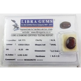 REPORT.NO.-LH 687CLARITY.-N/ACOLOUR.-COCA COLASHAPE/CUT.-OVALWT.-5.93 CTSDIMENSION.-2-8.10-1.4-8.R.INDEX.-1.92-2.02HARDNESS.-6.5-7.5COMMENT.-HESSONITE..