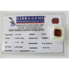 REPORT NO . LH 124CLARITY . N/ACOLOUR . COCA COLASHAPE / CUT . SQUAREWT . 3.72 CTSDIMENSION . 9-1.8-8.4-5.R . INDEX . 1.92-2.02HARDNESS . 6.5-7.5COMMENT . HESSONITE..