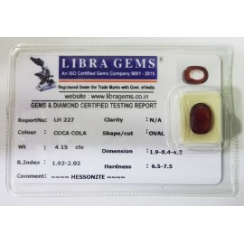 REPORT.NO.-LH 227CLARITY.-N/ACOLOUR.-COCA COLASHAPE/CUT.-OVALWT.-4.15 CTSDIMENSION.-1.9-8.4-4.3R.INDEX.-1.92-2.02HARDNESS.-6.5-7.5COMMENT.-HESSONITE..