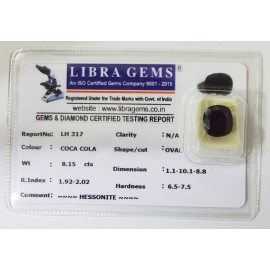 REPORT.NO.-LH 317CLARITY.-N/ACOLOUR.-COCA COLASHAPE/CUT.-OVALWT.-8.15 CTSDIMENSION.-1-1.10-1.8-8.R.INDEX.-1.92-2.02HARDNESS.-6.5-7.5COMMENT.-HESSONITE..