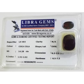 REPORT.NO.-LH 493CLARITY.-N/ACOLOUR.-COCA COLASHAPE/CUT.-OVALWT.-14.28 CTSDIMENSION.-6-2.2-5.8-1.R.INDEX.-1.92-2.02HARDNESS.-6.5-7.5COMMENT.-HESSONITE..