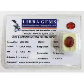 REPORT.NO.-LHS 173CLARITY.-N/ACOLOUR.-COCA COLASHAPE/CUT.-OVALWT.-4.61 CTSDIMENSION.-1-9.9-4.4-9.R.INDEX.-1.92-2.02HARDNESS.-6.5-7.5COMMENT.-HESSONITE { S }..