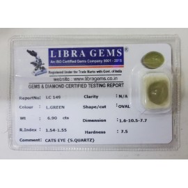 REPORT NO . LC 149CLARITY . N/ACOLOUR . L . GREENSHAPE / CUT . OVALWT .  6.90 CTSDIMENSION . 1-6.10-5.7-7.R . INDEX . 1.54-1.55HARDNESS . 75COMMENT . CATS EYE { S . QUARTZ }..