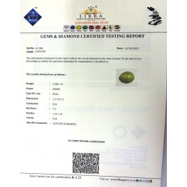 DATE:13-10-2023REF.NO:LC 980NAME:CATS EYE WEIGHT:4.30 CTSCOLOUR:GREENTYPE OF/CUT:OVALDIMENSION:1.2-7.8-7.1CONCLUSION:N/AHARDNESS:7.5R.INDEX:1.54-1.55CLARITY:N/ASPECIFIC COMMENTS:CATS EY..