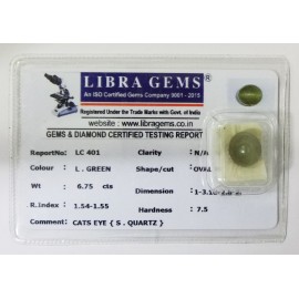 REPORT.NO.LC 401CLARITY.N/ACOLOUR.L.GREENSHAPE/CUT.OVALWT.6.75 CTSDIMENSION.1.3-10.2-8.2R.INDEX.1.54-1.55HARDNESS.7.5COMMENT.CATS EYE {S.QUARTZ}..