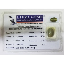 REPORT NO . LC 81CLARITY . N/ACOLOUR . L . GREENSHAPE / CUT . OVALWT . 8.70 CTSDIMENSION . 2-2.1-9.8-3.R . INDEX . 1.54-1.55HARDNESS . 7.5COMMENT . CATS EYE { S . QUARTZ }..