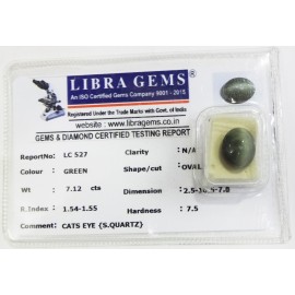 REPORT.NO.-LC 527CLARITY.-N/ACOLOUR.-GREENSHAPE/CUT.-OVALWT.-7.12 CTSDIMENSION.-2-5.10-5.7-8.R.INDEX.-1.54-1.55HARDNESS.-7.5COMMENT.-CATS EYE { S . QUARTZ }..