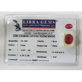 REPORT NO . LR 160CLARITY . N/ACOLOUR . PINKSHAPE / CUT . OVALWT . 4.03 CTSDIMENSION . 1-5.8-6.4-1.R . INDEX .  1.76-1.78HARDNESS . 9.0COMMENT . RUBY..