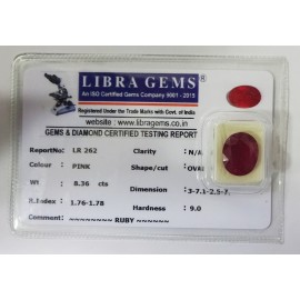 REPORT NO . LR 262CLARITY . N/ACOLOUR . PINKSHAPE / CUT . OVALWT . 8.36 CTSDIMENSION . 3-7.1-2.5-7.R . INDEX . 1.76-1.78HARDNESS . 9.0COMMENT . RUBY..