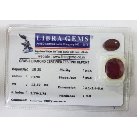 REPORT NO . LR 35CLARITY . N/ACOLOUR . PINKSHAPE / CUT . OVALWT . 11.37 CTSDIMENSION . 4-1.3-4.5-6.R . INDEX . 1.76-1.78HARDNESS . 9.0COMMENT . RUBY..