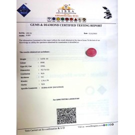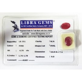 REPORT.NO.-LR 351CLARITY.-N/ACOLOUR.-PINKSHAPE/CUT.-OVALWT.-4.70 CTSDIMENSION.-10.8-8.1-5.6R.INDEX.-1.76-1.78HARDNESS.-9.0COMMENT.-RUBY..