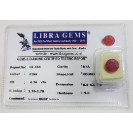 REPORT.NO.LR 466CLARITY.N/ACOLOUR.PINKSHAPE/CUT.ROUNDWT.4.36 CTSDIMENSION.8.4-8.5-5.9R.INDEX.1.76-1.78HARDNESS.9.0COMMENT.RUBY..