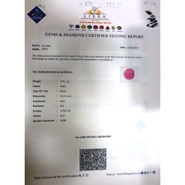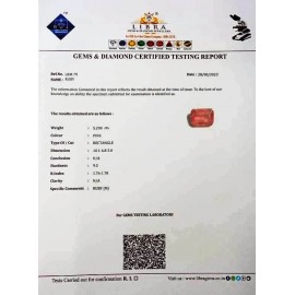 DATE:5-12-2023REF.NO;LRB 46NAME:RUBYWEIGHT:3.37 CTSCOLOUR:PINKTYPE OF/CUT:OVALDIMENSION:9.2-7.6-5.6CONCLUSION:N/AHARDNESS:9.0R.INDEX:1.76-1.78CLARITY:N/ASPECIFIC COMMENTS:BURMA RUBY {MAYANMAR}..