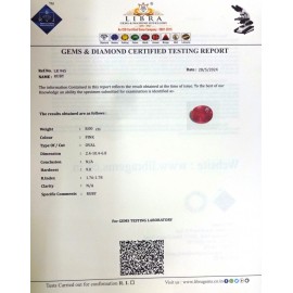 DATE: 11-4-2025REF.NO: LR  1085NAME: RUBYWEIGHT: 5.34 CTSCOLOUR: PINKTYPE OF/CUT: OVALDIMENSION: 9.2-9.1-6.2/CONCLUSION: N/AHARDNESS: 9.0R.INDEX: 1.76-1.78CLARITY: N/ASPECIFIC COMMENTS: RUBY..