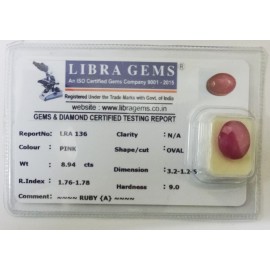 REPORT.NO.-LRA 136CLARITY.-N/ACOLOUR.-PINKSHAPE/CUT.-OVALWT.-8.94 CTSDIMENSION.-3-2.1-2.5-7.R.INDEX.-1.76-1.78HARDNESS.-9.0COMMENT.-RUBY { A }..