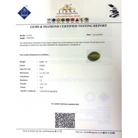REPORT.NO.-LC 730CLARITY.-N/ACOLOUR.-GREENSHAPE/CUT.-OVALWT.-4.10 CTSDIMENSION.-9-7.8-8.6-6.R.INDEX.- 1.54-1.55HARDNESS.-7.5COMMENT.-CATS EYE { S . QUARTZ }..