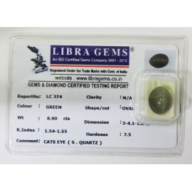 REPORT.NO.LC 374CLARITY.N/ACOLOUR.GREENSHAPE/CUT.OVALWT.8.90 CTSDIMENSION.3.4-1.1-8.5R.INDEX.1.54-1.55HARDNESS.7.5COMMENT.CATS EYE {S.QUARTZ}..
