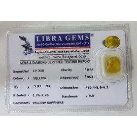 REPORT NO . LY 218CLARITY . N/ACOLOUR . YELLOWSHAPE / CUT . OVALWT . 5.92 CTSDIMENSION . 10-4.8-8.6-3.R . INDEX . 1.76-1.78HARDNESS . 9.0COMMENT . YELLOW SAPPHIRE..