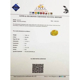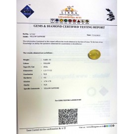 REPORT NO . LY 202CLARITY . N/ACOLOUR . YELLOWSHAPE / CUT . OVALWT . 5.47 CTSDIMENSION . 1-4.8-7.5-8.R . INDEX . 1.76-1.78HARDNESS . 9.0COMMENT . YELLOW SAPPHIRE..