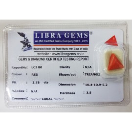 REPORT.NO.LCI 666CLARITY.N/ACOLOUR.REDSHAPE/CUT.TRIANGLEWT.3.38 CTSDIMENSION.2.9-1.5-4.1R.INDEX.N/AHARDNESS.3.5COMMENT.CORAL..
