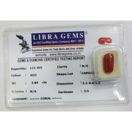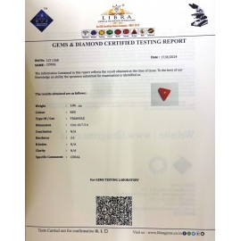 REPORT NO . LCI 242CLARITY . N/ACOLOUR . REDSHAPE / CUT . CAPSULEWT . 5.19 CTSDIMENSION . 7-5.6-1.5-7.R . INDEX . N/AHARDNESS . 3.5COMMENT . CORAL..