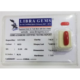 REPORT.NO.LCI 526CLARITY.N/ACOLOUR.REDSHAPE/CUT.CAPSULEWT.3.54 CTSDIMENSION.5.5-5.2-4.9R.INDEX.N/AHARDNESS.3.5COMMENT.CORAL..
