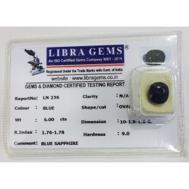 REPORT.NO.-LN 236CLARITY.-N/ACOLOUR.-BLUESHAPE/CUT.-OVALWT.-6.00 CTSDIMENSION.-10-1.9-1.6-6.R.INDEX.-1.76-1.78HARDNESS.-9.0COMMENT.-BLUE SAPPHIRE..