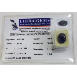 REPORT.NO.-LN 268CLARITY.-N/ACOLOUR.-BLUESHAPE/CUT.-OVALWT.-7.19 CTSDIMENSION.-1-1.8-7.7-1.R.INDEX.-1.76-1.78HARDNESS.-9.0COMMENT.-BLUE SAPPHIRE..