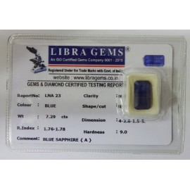 REPORT NO . LNA 23CLARITY . N/ACOLOUR . BLUESHAPE / CUT . RECTANGLEWT . 7.29 CTSDIMENSION . 4-2.8-1.5-5.R . INDEX . 1.76-1.78HARDNESS . 9.0COMMENT . BLUE SAPPHIRE { A }..