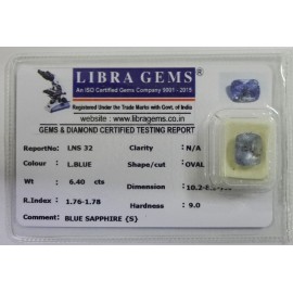 REPORT.NO.-LNS 32CLARITY.-N/ACOLOUR.-L. BLUESHAPE/CUT.-OVALWT.-6.40 CTSDIMENSION.-10-2.8-5.7-4.R.INDEX.-1.76-1.78HARDNESS.-9.0COMMENT.-BLUE SAPPHIRE { S }..