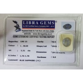 REPORT NO . LNS 15CLARITY . N/ACOLOUR . L . BLUESHAPE / CUT . OVALWT . 5.31 CTSDIMENSION . 10-2.8-4.6-4.R . INDEX . 1.76-1.78HARDNESS . 9.0COMMENT . BLUE SAPPHIRE { S }..