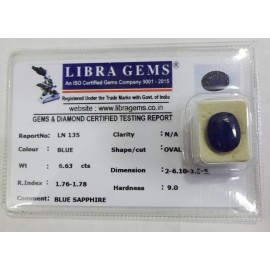 REPORT NO . LN 135CLARITY . N/ACOLOUR . BLUESHAPE / CUT . OVALWT . 6.63 CTSDIMENSION . 2-6.10-3.5-5.R . INDEX . 1.76-1.78HARDNESS . 9.0COMMENT . BLUE SAPPHIRE..
