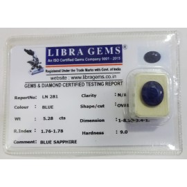 REPORT.NO.-LN 281CLARITY.-N/ACOLOUR.-BLUESHAPE/CUT.-OVALWT.-5.28 CTSDIMENSION.-1-8.10-3.4-1.R.INDEX.-1.76-1.78HARDNESS.-9.0COMMENT.-BLUE SAPPHIRE..