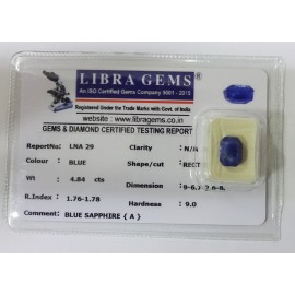 REPORT NO . LNA 29CLARITY . N/ACOLOUR . BLUESHAPE / CUT . RECTANGLEWT . 4.84 CTSDIMENSION . 9-6.7-2.6-8.R . INDEX . 1.76-1.78HARDNESS . 9.0COMMENT . BLUE SAPPHIRE { A }..