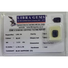 REPORT NO . LN 77CLARITY . N/ACOLOUR . BLUESHAPE / CUT . OVALWT . 3.30 CTSDIMENSION . 9-3.7-8.4-5.R . INDEX . 1.76-1.78HARDNESS . 9.0COMMENT . BLUE SAPPHIRE..