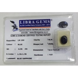 REPORT NO . LN 190CLARITY . N/ACOLOUR . BLUESHAPE / CUT . OVALWT . 4.36 CTSDIMENSION . 9-5.7-4.5-9.R . INDEX . 1.76-1.78HARDNESS . 9.0COMMENT . BLUE SAPPHIRE..
