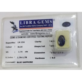 REPORT.NO.-LN 256CLARITY.-N/ACOLOUR.-BLUESHAPE/CUT.-OVALWT.-3.79 CTSDIMENSION.-1-3.7-3.4-3.R.INDEX.-1.76-1.78HARDNESS.-9.0COMMENT.-BLUE SAPPHIRE..