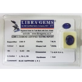 REPORT NO . LNA 9CLARITY . N/ACOLOUR . BLUESHAPE / CUT . OVALWT . 5.03 CTSDIMENSION . 1-4.9-3.5-2.R . INDEX . 1.76-1.78HARDNESS . 9.0COMMENT . BLUE SAPPHIRE { A }..