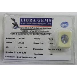 REPORT.NO.-LNS 40CLARITY.-N/ACOLOUR.-L. BLUESHAPE/CUT.-OVALWT.-3.68 CTSDIMENSION.-10-2.7-8.4-6.R.INDEX.-1.76-1.78HARDNESS.-9.0COMMENT.-BLUE SAPPHIRE { S }..