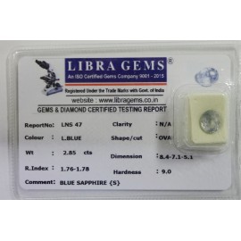 REPORT.NO.-LNS 47CLARITY.-N/ACOLOUR.-L. BLUESHAPE/CUT.-OVALWT.-2.85 CTSDIMENSION.-8-4.7-1.5-1.R.INDEX.-1.76-1.78HARDNESS.-9.0COMMENT.-BLUE SAPPHIRE { S }..
