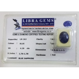 REPORT.NO.-LN 263CLARITY.-N/ACOLOUR.-BLUESHAPE/CUT.-OVALWT.-4.28 CTSDIMENSION.-2-4.10-2.3-3.R.INDEX.-1.76-1.78HARDNESS.-9.0COMMENT.-BLUE SAPPHIRE..