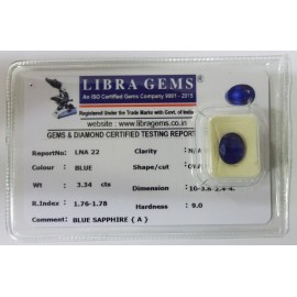REPORT NO . LNA 22CLARITY . N/ACOLOUR . BLUESHAPE / CUT . OVALWT . 3.34 CTSDIMENSION . 10-3.8-2.4-4.R . INDEX . 1.76-1.78HARDNESS . 9.0COMMENT . BLUE SAPPHIRE { A }..