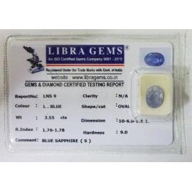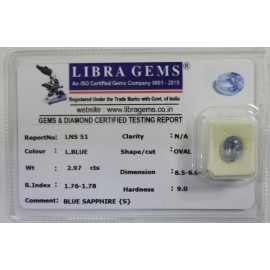 REPORT.NO.-LNS 51CLARITY.-N/ACOLOUR.-L. BLUESHAPE/CUT.-OVALWT.-2.97 CTSDIMENSION.-8-5.6-6.5-4.R.INDEX.-1.76-1.78HARDNESS.-9.0COMMENT.-BLUE SAPPHIRE { S }..