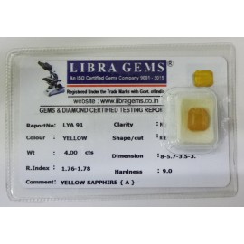 REPORT.NO.LYA 91CLARITY.N/ACOLOUR.YELLOWSHAPE/CUT.RECTANGLEWT.4.00 CTSDIMENSION.8.5-7.3-5.3R.INDEX.1.76-1.78HARDNESS.9.0COMMENT.YELLOW SAPPHIRE {A}..