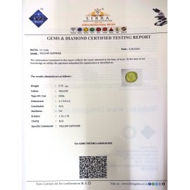 REPORT NO . LYA 38CLARITY . N/ACOLOUR . YELLOWSHAPE / CUT . OVALWT . 3.88 CTSDIMENSION . 10-9.8-8.3-7.R . INDEX . 1.76-1.78HARDNESS . 9.0COMMENT . YELLOW SAPPHIRE { A }..