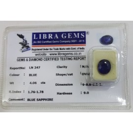 REPORT.NO.-LN 247CLARITY.-N/ACOLOUR.-BLUESHAPE/CUT.-OVALWT.-4.06 CTSDIMENSION.-9-8.8-5.5-1.R.INDEX.-1.76-1.78HARDNESS.-9.0COMMENT.-BLUE SAPPHIRE..