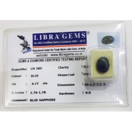 REPORT.NO.-LN 280CLARITY.-N/ACOLOUR.-BLUESHAPE/CUT.-OVALWT.-4.77 CTSDIMENSION.-10-5.8-3.5-3.R.INDEX.-1.76-1.78HARDNESS.-9.0COMMENT.-BLUE SAPPHIRE..