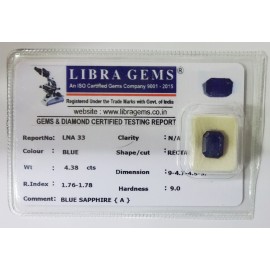 REPORT NO . LNA 33CLARITY . N/ACOLOUR . BLUESHAPE / CUT . RECTANGLEWT . 4.38 CTSDIMENSION . 9-4.7-4.5-5.R . INDEX . 1.76-1.78HARDNESS . 9.0COMMENT . BLUE SAPPHIRE { A }..