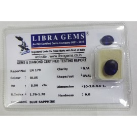 REPORT NO . LN 179CLARITY . N/ACOLOUR . BLUESHAPE / CUT . OVALWT . 5.06 CTSDIMENSION . 10-3.8-8.6-1.R . INDEX . 1.76-1.78HARDNESS . 9.0COMMENT . BLUE SAPPHIRE..