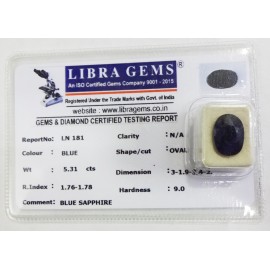 REPORT NO . LN 181CLARITY . N/ACOLOUR . BLUESHAPE / CUT . OVALWT . 5.31 CTSDIMENSION . 3-1.9-3.4-2.R . INDEX . 1.76-1.78HARDNESS . 9.0COMMENT . BLUE SAPPHIRE..